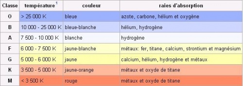 tableau des différentes classes d'étoiles, de leur température et de leur composition